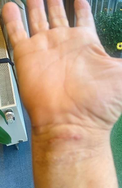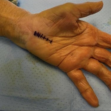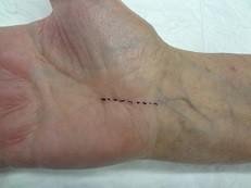Kortom: Ik ben zeer tevreden met het resultaat van deze ingreep, en ik wil iedereen aanraden niet te blijven rondlopen met carpaal tunnel syndroom. Het euvel kan via een kijkoperatie en een kleine incisie verholpen worden. Mijn hand zag er na een week zo uit: